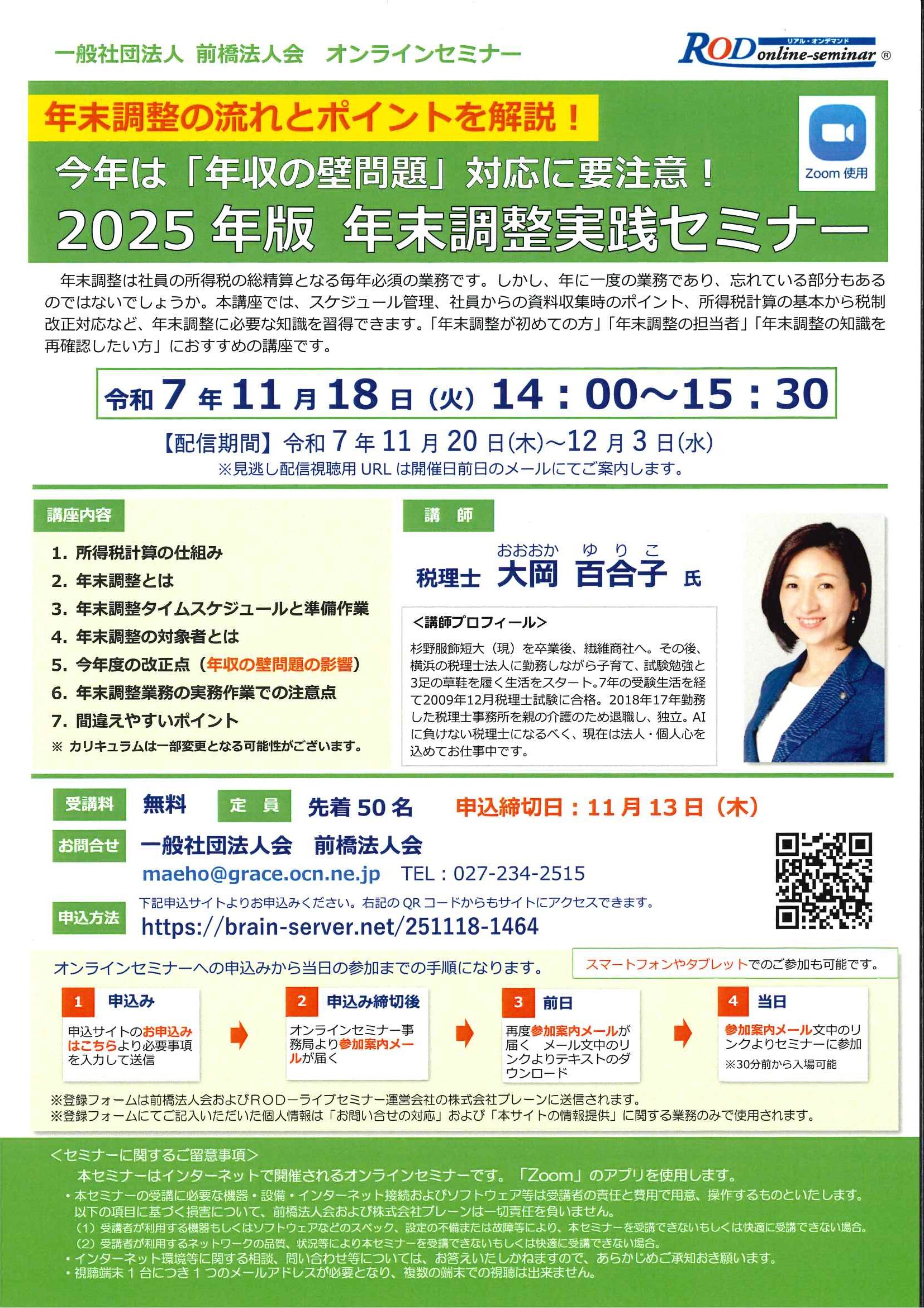 令和7年11月18日(火)14:00~ 2025年版 年末調整実践オンラインセミナーを開催します。